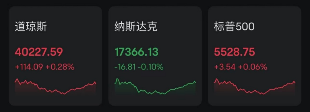 当地时间4月28日,美股三大指数涨跌不一。截至收盘,道指涨114.09点,涨幅0.28%,报40227.59点;纳指跌16.81点,跌幅0.10%,报17366.13点;标普500指数涨3.54点,涨幅0.06%,报5528.75点。